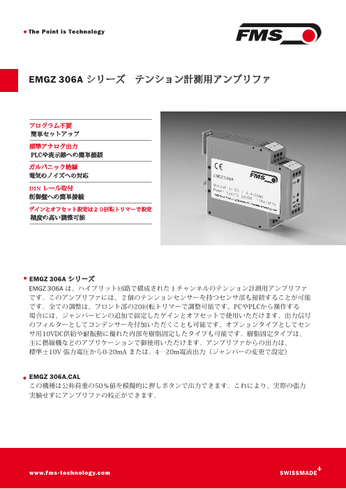 EMGZ 310 シリーズデジタルテンションメジャリングアンプは FMSの全てのセンサーに 対応しています。この最新型多機能アンプはアナログタイプのアンプに替って配線して 簡単に置き換えが可能です。 判り易い設定手順、全てのパラメータは3つのキーで...