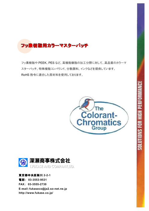 PEEK、PES等のスーパーエンジニアプラスチック、PFA、FEP、ETFE等のフッ素樹脂着色用カラーマスターバッチです。 カロラントクロマティック社は、これらのスーパーエンジニアプラスチック用顔料の専門メーカーでRoHS指令に適合しています。