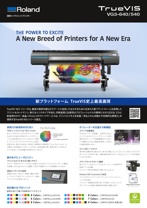 TrueVIS VG3シリーズは、最高の画質を誰もがスマートに安定して出力するために生まれた新プラットフォームを採用したプリント&カットマシン。新たなインクタイプを加え、印刷品質と生産性はプロフェッショナルの期待に大きく応える。さらに新採用のカラー液晶パ...
