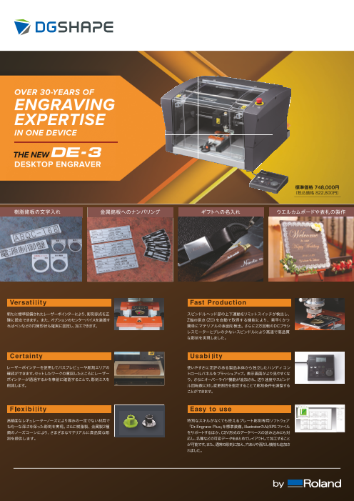最新の技術を搭載し、高精度と使いやすさを実現したDE-3。銘板をはじめとする本格的な工業用途、彫刻特有の高級感を付加するギフト・アクセサリー用途や立体サインなどのディスプレイまであらゆる場面でお客様のビジネスをサポートします。