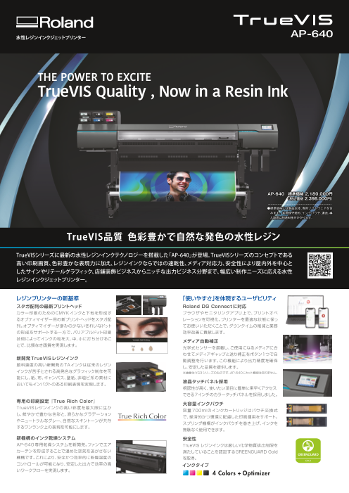 Roland DG初となるレジンインクジェットプリンター。速乾性に加え、低ランニングコスト、さまざまな用途への対応力で、サイングラフィックビジネスの立ち上げと拡張をサポートします。 ・スタガ配列のツインヘッドとバリアブルドット印刷技術に、専用の印刷...