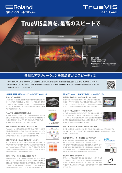 XG-640は、TrueVISシリーズの圧倒的な高画質と多彩な表現力を併せ持った、当社史上最速のPrint&Cutマシン。鮮やかなグラフィックを描き出す「プリント機能」ち印刷されたグラフィックの外枠を自由な形状に切り抜くことができる「カッティング機能」の...