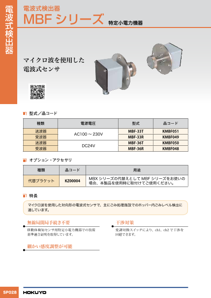 ●マイクロ波を使用した対向形の電波式センサで、主にごみ処理施設でのホッパー内ごみレベル検出に適しています。 ●無線局開局手続き不要 ●変調切換スイッチにより、ch1、ch2で干渉を回避できます。 ●細かい感度調整が可能