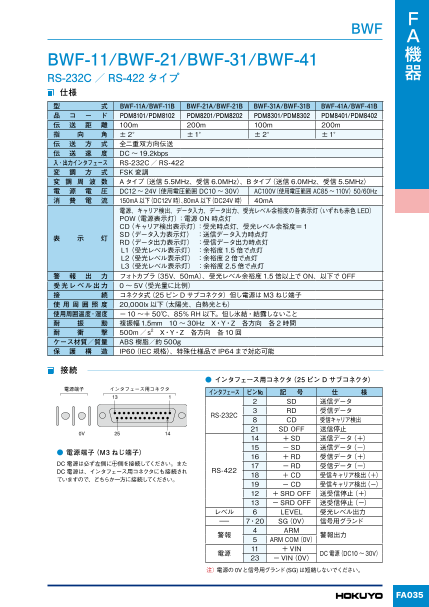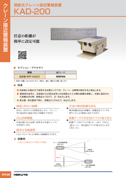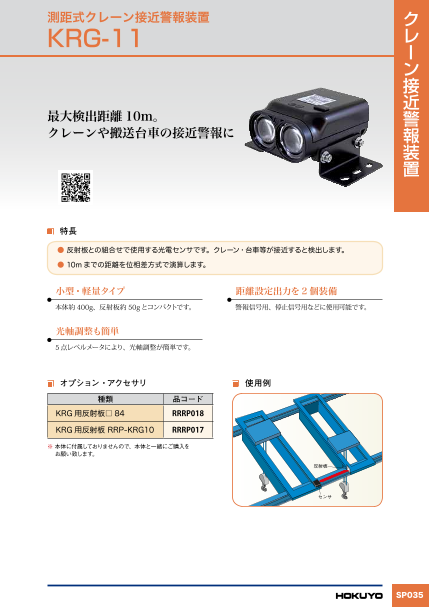 ●リフレクタ反射板との組み合わせで使用する光電センサ。クレーン、台車等が接近すると検出 ●基準投光信号と、反射板からの受光信号との位相差より2点間の距離を演算し、任意に設定された距離以内のとき、制御出力(OUT1,2)を出力 ●発光量・受光量低下時に...