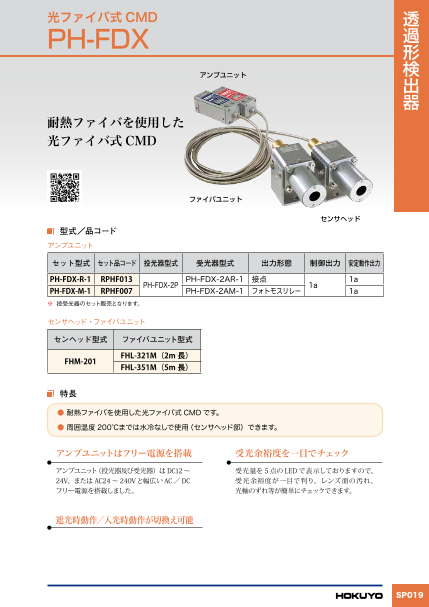 ●耐熱ファイバを使用した光ファイバ式CMDです。 ●周囲温度200℃までは水冷なしで使用(センサヘッド部)できます。 ●アンプユニットはフリー電源を搭載 ●遮光時動作/入光時動作が切換え可能 ●受光余裕度を一目でチェック