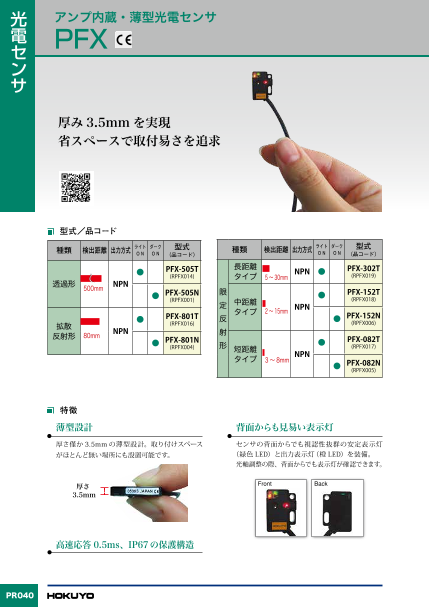 ●厚さ僅か3.5mmの薄型設計。 取り付けスペースがほとんど無い場所にも設置可能です。 ●センサの背面からでも視認性抜群の安定表示灯(緑色LED)と出力表示灯(橙LED)を装備。 光軸調整の際、背面からでも表示灯が確認できます。 ●高速応答0...