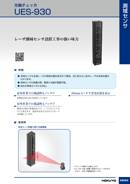 ● 測域センサの走査レーザの照射位置を表示灯で確認。目に見えない赤外レーザの走査位置がわかります。 ● 測域センサの設置の際、簡単に光軸が調整可能。 ● 他社の測域センサにも対応。