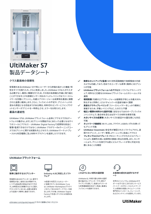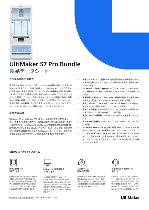 掲載製品 ◆UltiMaker S3 ◆UltiMaker S5 ◆UltiMaker S7 ◆UltiMaker S7 Pro Bundle ◆詳細はカタログをダウンロードしご覧いただくか、お気軽にお問い合わせ下さい。