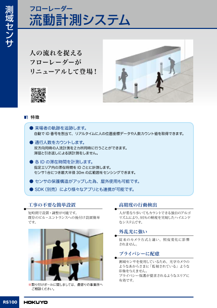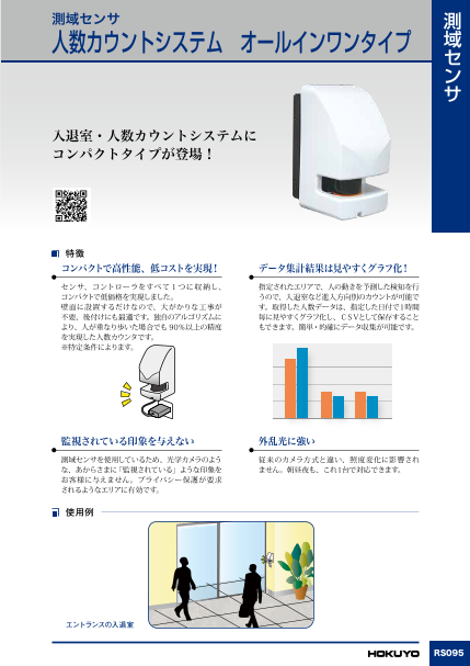 ●コンパクトで高性能、低コストを実現! ●データ集計結果は見やすくグラフ化! ●測域センサを使用しているため、光学カメラのような、あからさまに「監視されている」ような印象をお客様に与えません。 ●外乱光に強い。