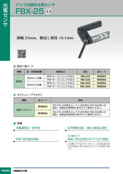 ●光軸調整は一切不要 ●応答時間が速く、優れた繰返し精度 ●EMC指令適合商品 ●2光軸タイプ 減速・停止位置を1台で検出