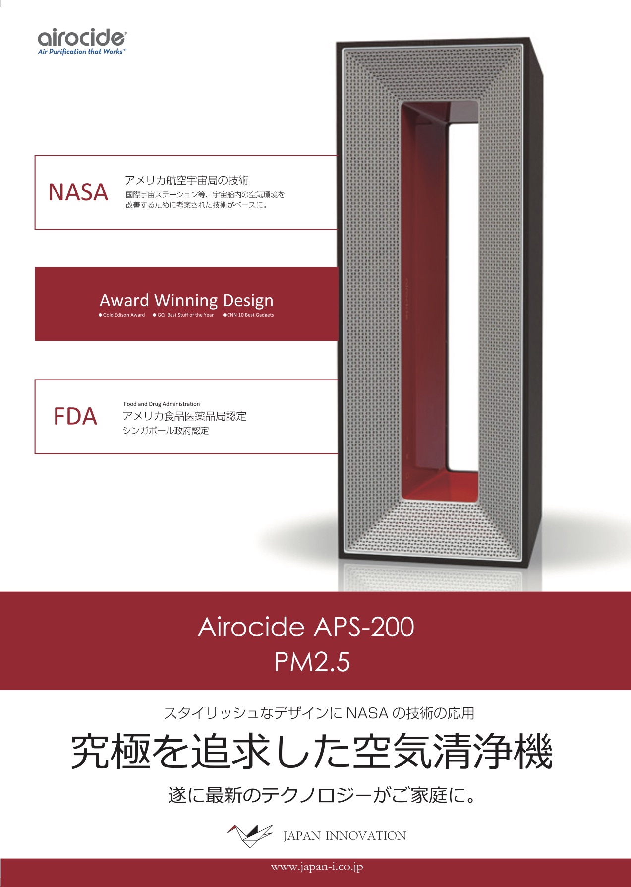 究極を追求した空気清浄機 ・アメリカ航空宇宙局の技術 国際宇宙ステーション等、宇宙船内の空気環境を改善する為に考案された技術がベース ・FDA アメリカ食品医療薬品認定 シンガポール政府認定