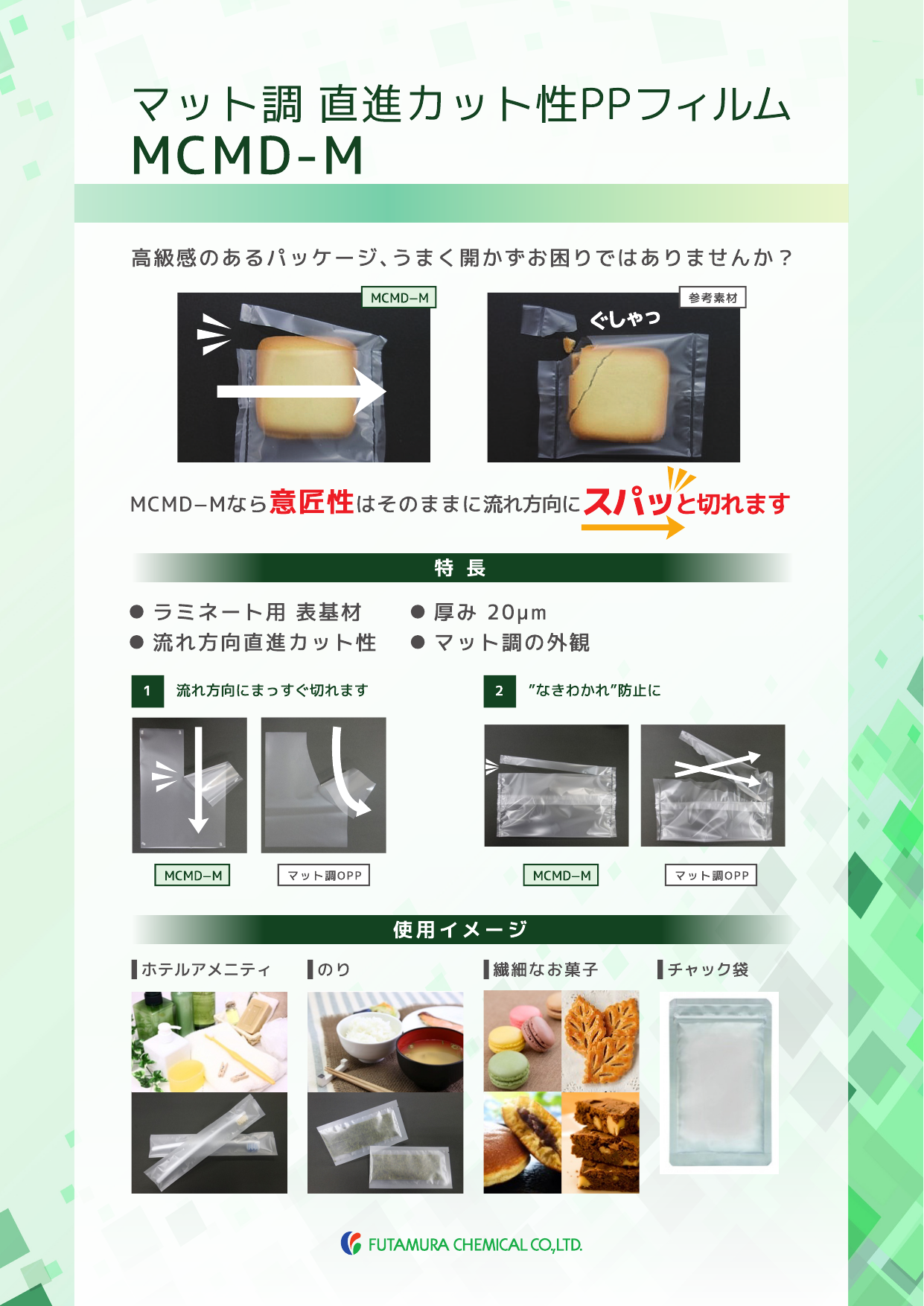 掲載内容 ○マット調直進カット性PPフィルム 高級感のあるパッケージ、うまく開かずにお困りではありませんか? MCMD-Mなら意匠性はそのままに流れ方向にスパッと切れます。 ○OPP自己粘着性フィルムFSA(R) 自己粘着性でありながら、強粘着...