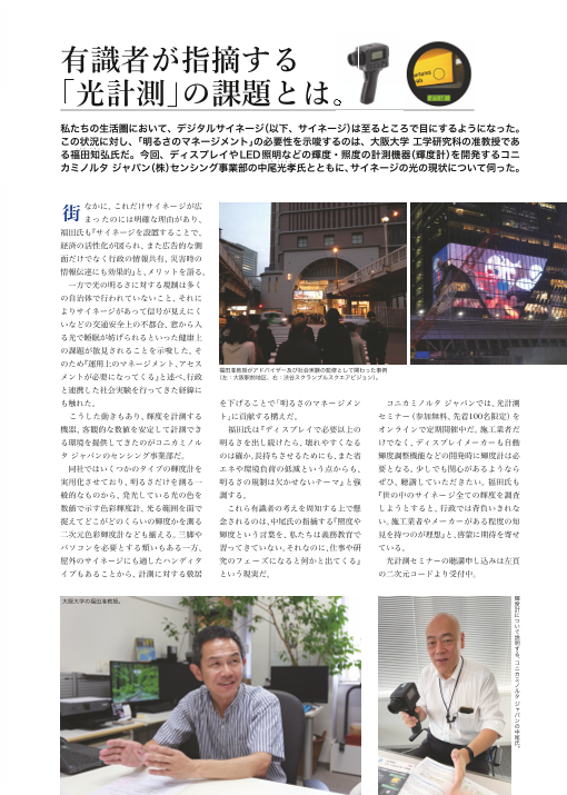 私たちの生活圏において、デジタルサイネージは至るところで目にするになりました。 この状況に対し「明るさのマネージメント」について大阪大学 工学研究科の准教授 福田知弘氏と ディスプレイやLED照明などの輝度・照度の計測機器(輝度計)を活用したサイネー...