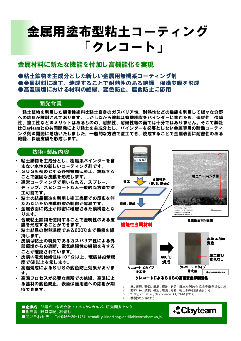 【特徴】 ○粘土鉱物を主成分とした新しい金属用無機系コーティング剤 ○金属材料の塗工、焼成することで耐熱性の絶縁、保護被膜を形成 ○高温環境における材料の絶縁、変色防止、腐食防止に応用