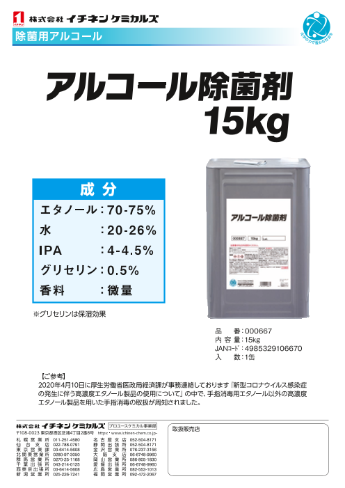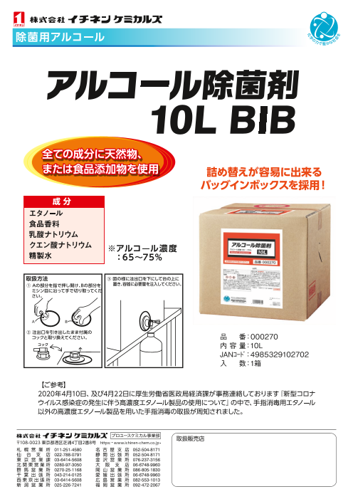 アルコール除菌剤10Lバックインボックスタイプ 付属のコックで注入できるので詰め替え作業が容易です。アルコール濃度65~75% 新型コロナ、コロナ、インフルエンザ等 ウイルスの殺菌、除菌に。食品添加物を使用しているので安心です。
