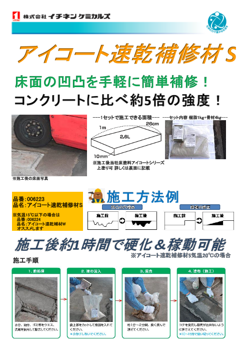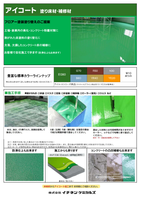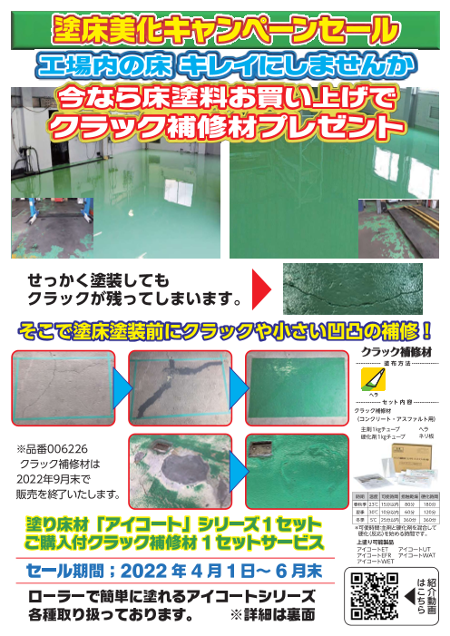 工場床の塗料キャンペーン 2022年4月1日~6月末までの期間中、 塗床剤アイコートシリーズご購入のお客様にクラック補修剤を1セット無償サービスいたします。