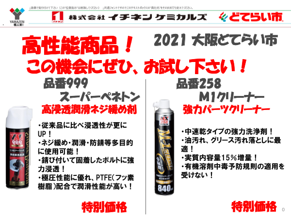 品番999 スーパーペネトン 高浸透潤滑ネジ緩め剤 ・ネジ緩め、潤滑、防錆等多目的に使用可能。 ・錆び付いて固着したボルトに強力浸透。 ・極圧性能に優れ、PTFE(フッ素樹脂)配合で潤滑性能が高い。 品番258 M1クリーナー 超強力パーツク...