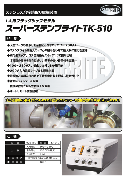 ・大型ワークの焼取りも余裕でこなすハイパワー ・ステンブライト高耐久モップとの組み合わせで最大限に能力を発揮 ・刷毛型モップ、コテ型電極もスイッチ1つで簡単切替 ・100~240V入力対応で海外でも使用可能 ・200V入力電源ケーブルも標準搭載 ...