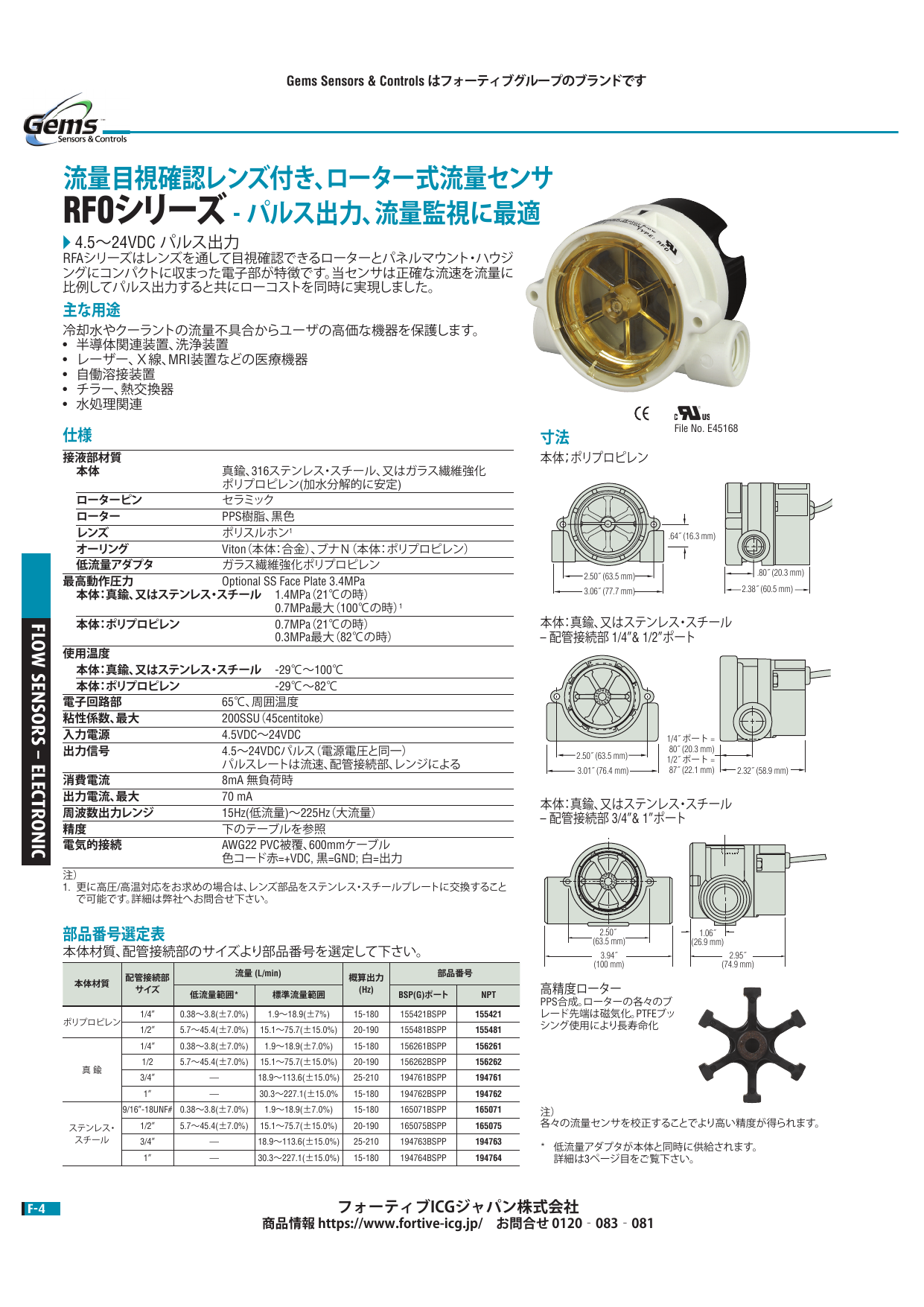 •4.5~24VDC パルス出力 RFAシリーズはレンズを通して目視確認できるローターとパネルマウント・ハウジ ングにコンパクトに収まった電子部が特徴です。当センサは正確な流速を流量に 比例してパルス出力すると共にローコストを同時に実現しました。