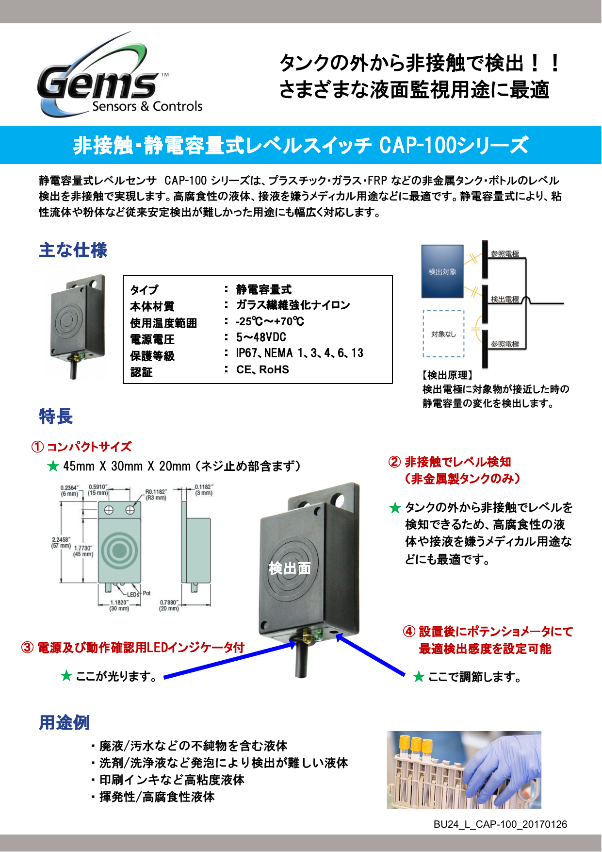 ・静電容量式 ・本体材質:ガラス繊維強化ナイロン ・使用温度範囲:-25℃~+70℃ ・電源電圧:5~48VDC ・保護等級:IP67 ・製品サイズ:45㎜×30㎜×20㎜(ネジ止め部除く)