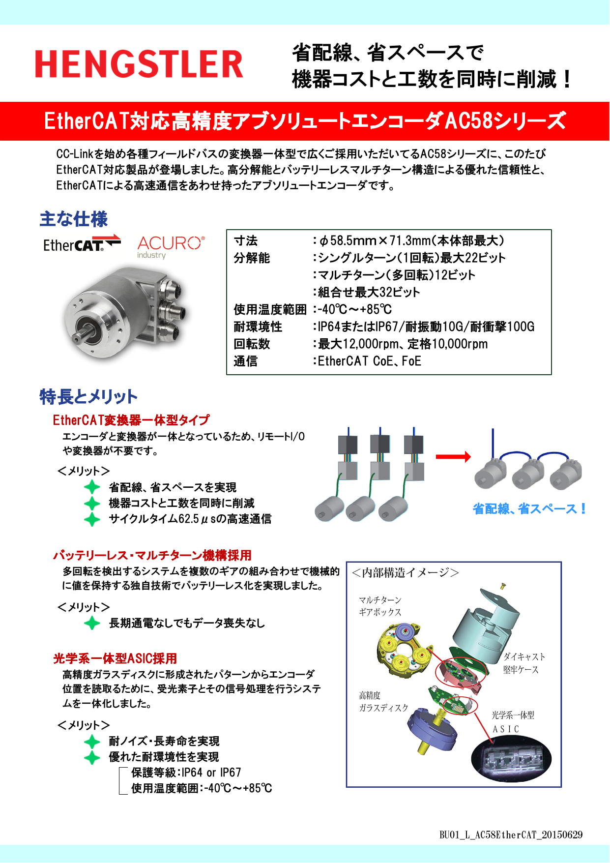 コンパクトデザイン:シングルターン・マルチターン共に本体奥行が50mm ■バッテリーレス・ギア式マルチターン ■分解能:シングルターン17Bit(Max) / マルチターン12Bit(Max) ■OptoAsic(オプトエーシック)による自己診断機...