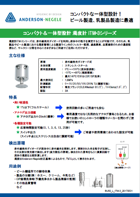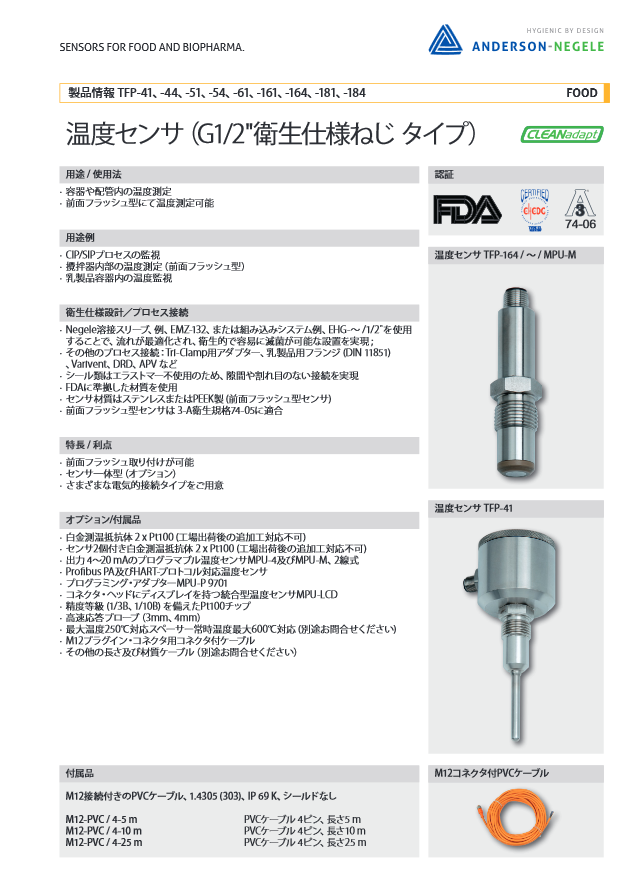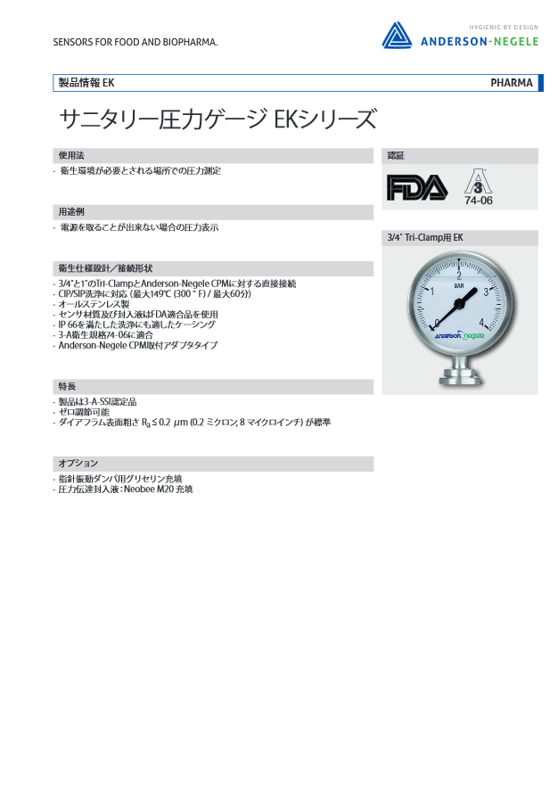 ・製品は3-A-SSI認定品 ・3/4"と1"のTri-ClampとAnderson-Negele CPMに対する直接接続 ・CIP/SIP洗浄に対応(最大149℃ (300 °F) / 最大60分) ・センサ材質及び封入液はFDA適合品を使用
