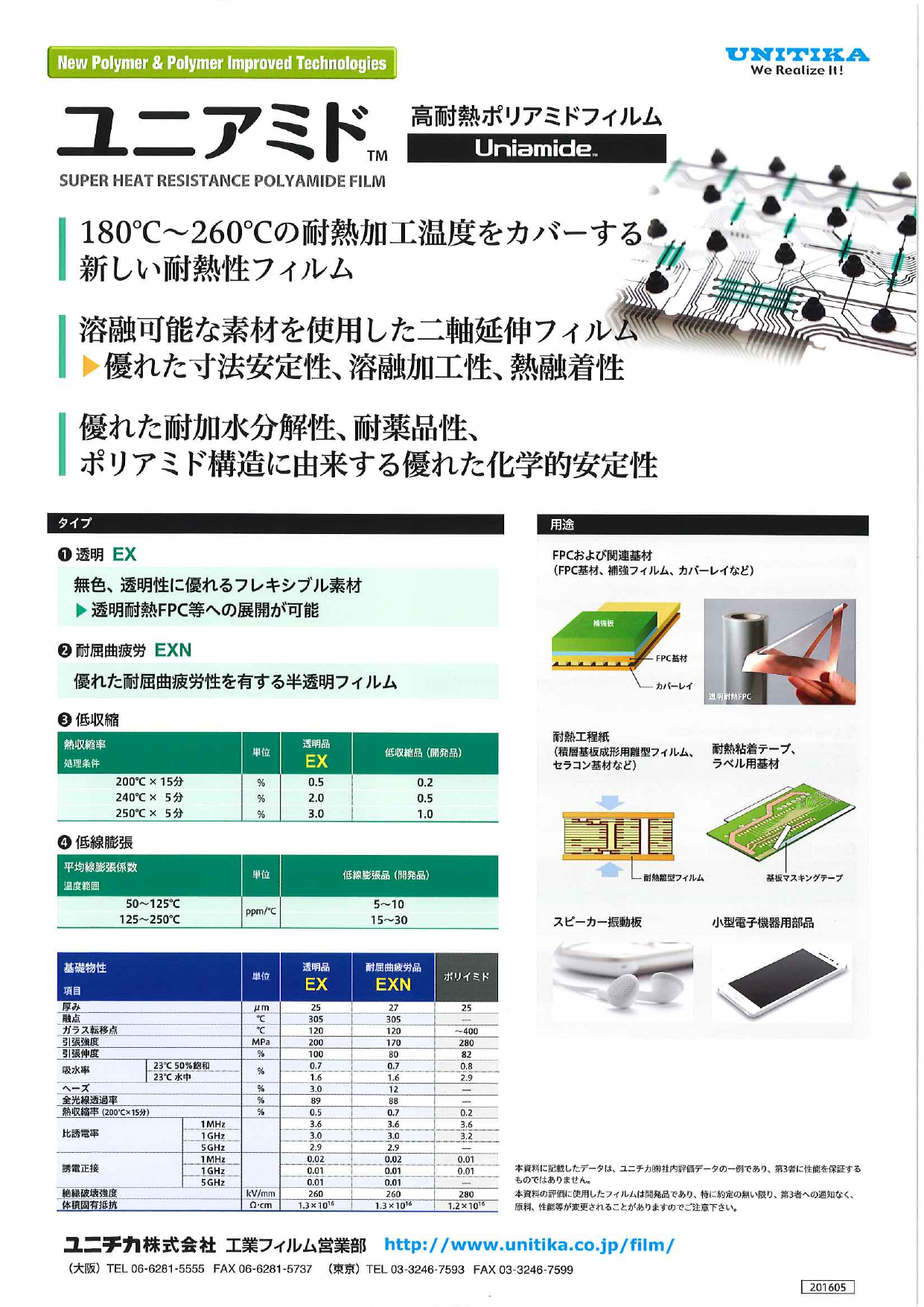 【特徴】 ○180℃~260℃の耐熱加工温度をカバーする新しい耐熱性フィルム。 ○溶融可能な素材を使用した二軸延伸フィルム。 ○優れた耐加水分解性、耐薬品性、ポリアミド構造に由来する優れた化学的安定性。