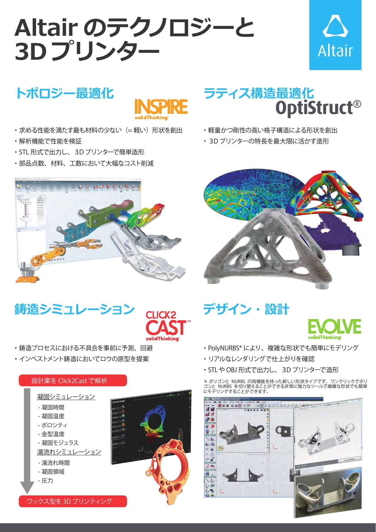 ・トポロジー最適化 INSPIRE ・ラティス構造最適化 OptiStruct ・鋳造シミュレーション CLICK2 CAST ・デザイン・設計 EVOLVE ・Simulation-driven Design Weekのご案内