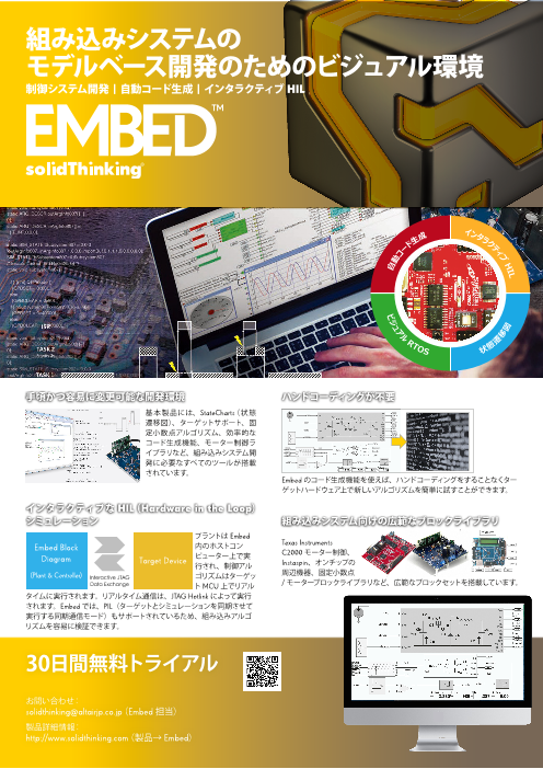 非常に効率よくダイアグラムからコードを生成できる機能を使って、開発期間の短縮と製品品質の向上を実現できます。 solidThinking Embedがあれば、あらゆる動的システムの仮想プロトタイプを素早く開発できます。 モデルを構築するには、ブロッ...