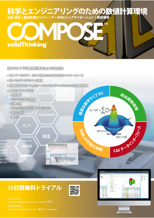solidThinking Compose により、エンジニア、科学者、製品クリエイターは、高度なマトリクスベースの数値計算言語とインタラクティブな統合プログラミング環境を使って、多彩な数値計算や自動化が可能になります。マトリクス解析や微分方程式の求解、...