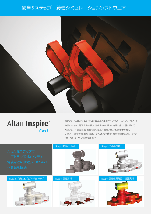 Altair Inspire Castは、製造部品の改良や最適化を可能にする鋳造プロセスシミュレーションソフトウェアです。 Inspire Castは、シンプルかつ高速な、溶湯充填および凝固のシミュレーションにより、巻き込み巣、引け巣、湯境などの鋳...