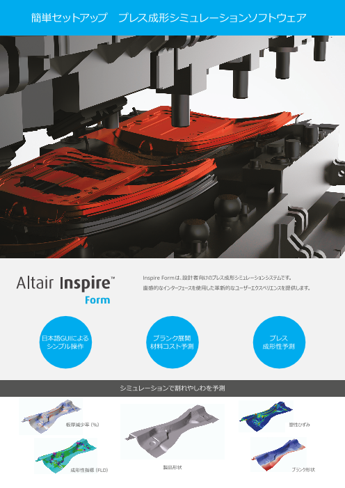 Altair Inspire Formは、設計上流工程で成形性、材料歩留り、材料コストを検討し、製品製造効率を考慮しながらより優れた製品設計を可能にするプレス成形シミュレーションソフトウェアです。