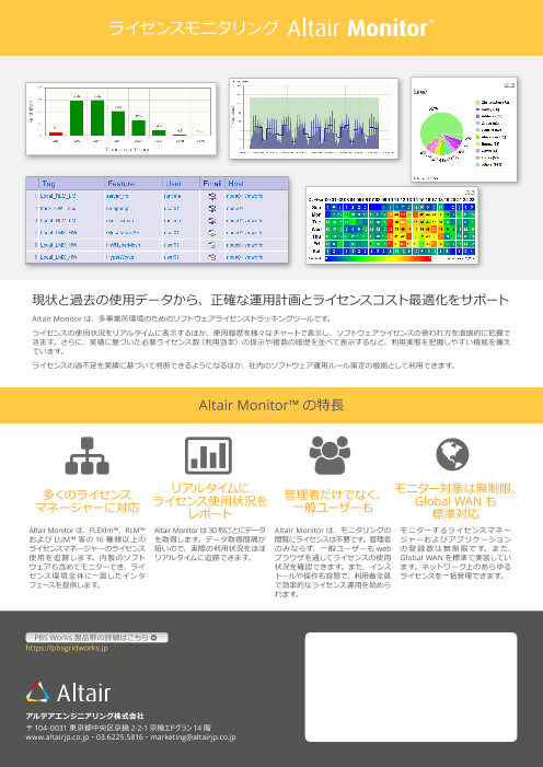 Altair Monitorは、マルチサイト環境の現在および過去のソフトウェアライセンス利用率を把握できる、ソフトウェアライセンス追跡ツールです。ソフトウェアライセンスの空き状況と使用統計を収集し、わかりやすいGUIでリアルタイムに表示します。