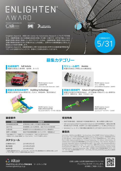 Enlighten Awardは、米国CAR: Center for Automotive Researchとアルテアが共催する、自動車産業における軽量化技術を対象とする唯一の賞です。ますます厳しくなる軽量化目標の達成に貢献しているサプライヤーを含め、自...