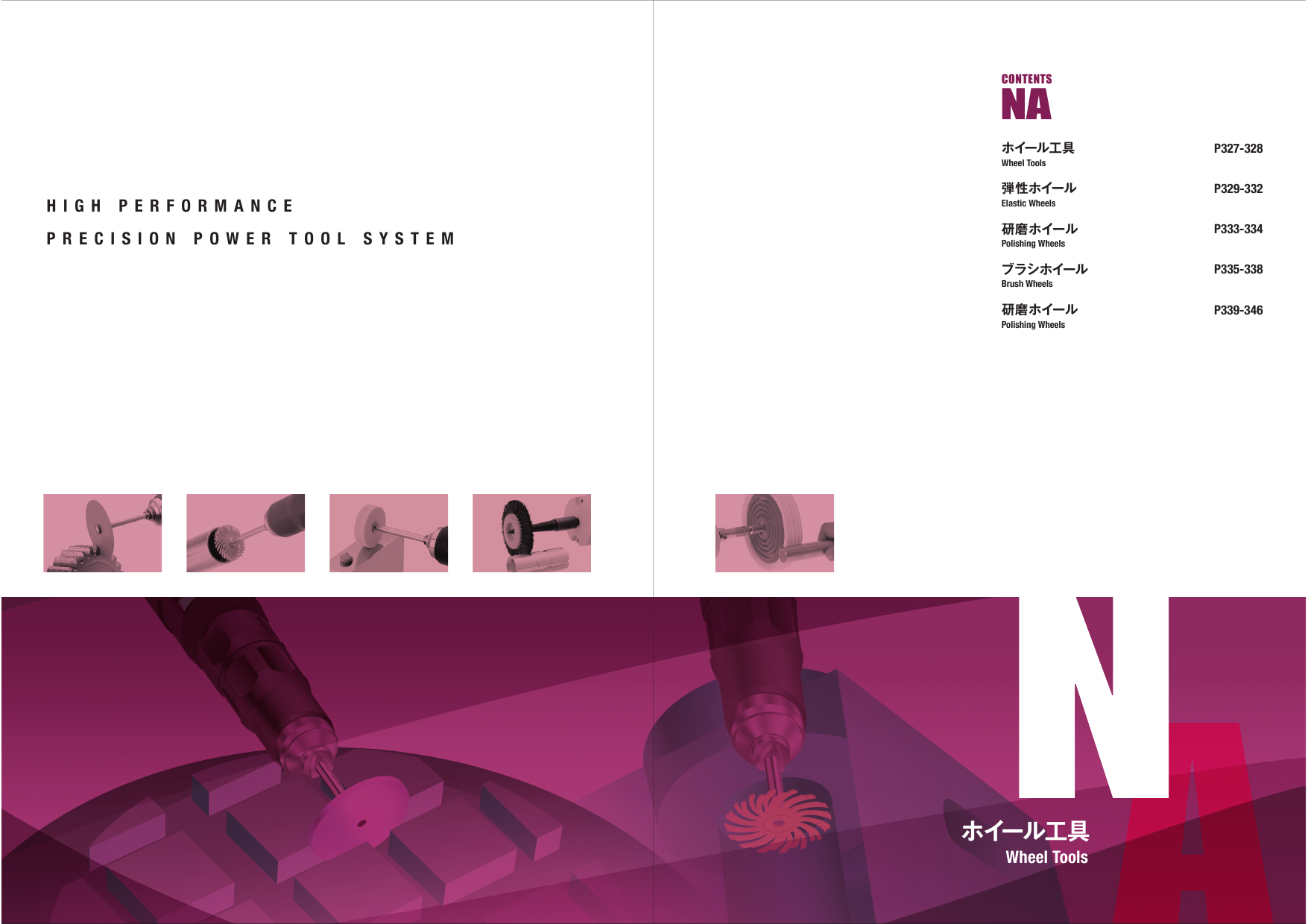 【掲載製品一覧】 ■ホイール工具 Wheel Tools ■弾性ホイール Elastic Wheels ■研磨ホイール Polishing Wheels ■ブラシホイール Brush Wheels ■研磨ホイール Polishing Wheels