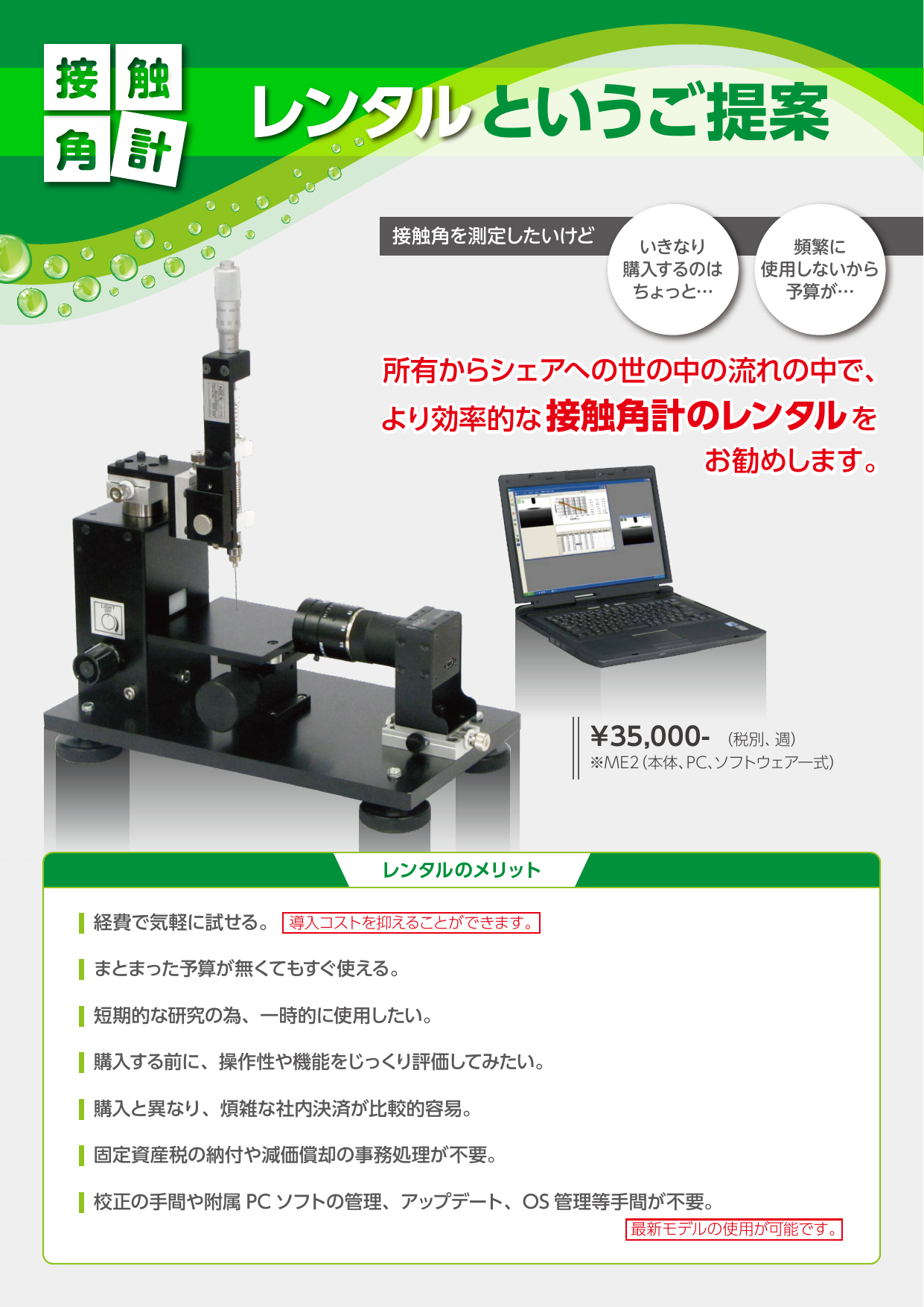 プラズマ照射、コロナ処理、エキシマ処理やUV表面処理といった表面改質後のはっ水性や親水性、溌油性や親油性の評価に最適です。 校正の手間や、セットアップ等が不要で、すぐご利用可能です。