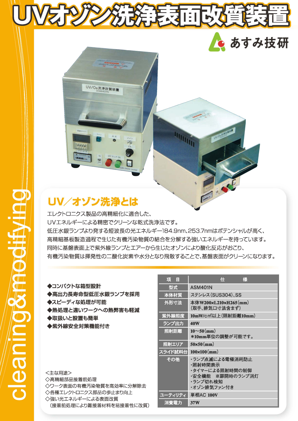 エレクトロニクス製品の高精細化に適合した、UVエネルギーによる精密でクリーンな乾式洗浄法です。 オゾン分解ユニット付き(オプション)もご選択可能で、 実験室など排気設備の無い場所でも、100Vの電源のみで気軽にご使用できます。 【主な用途】 ...