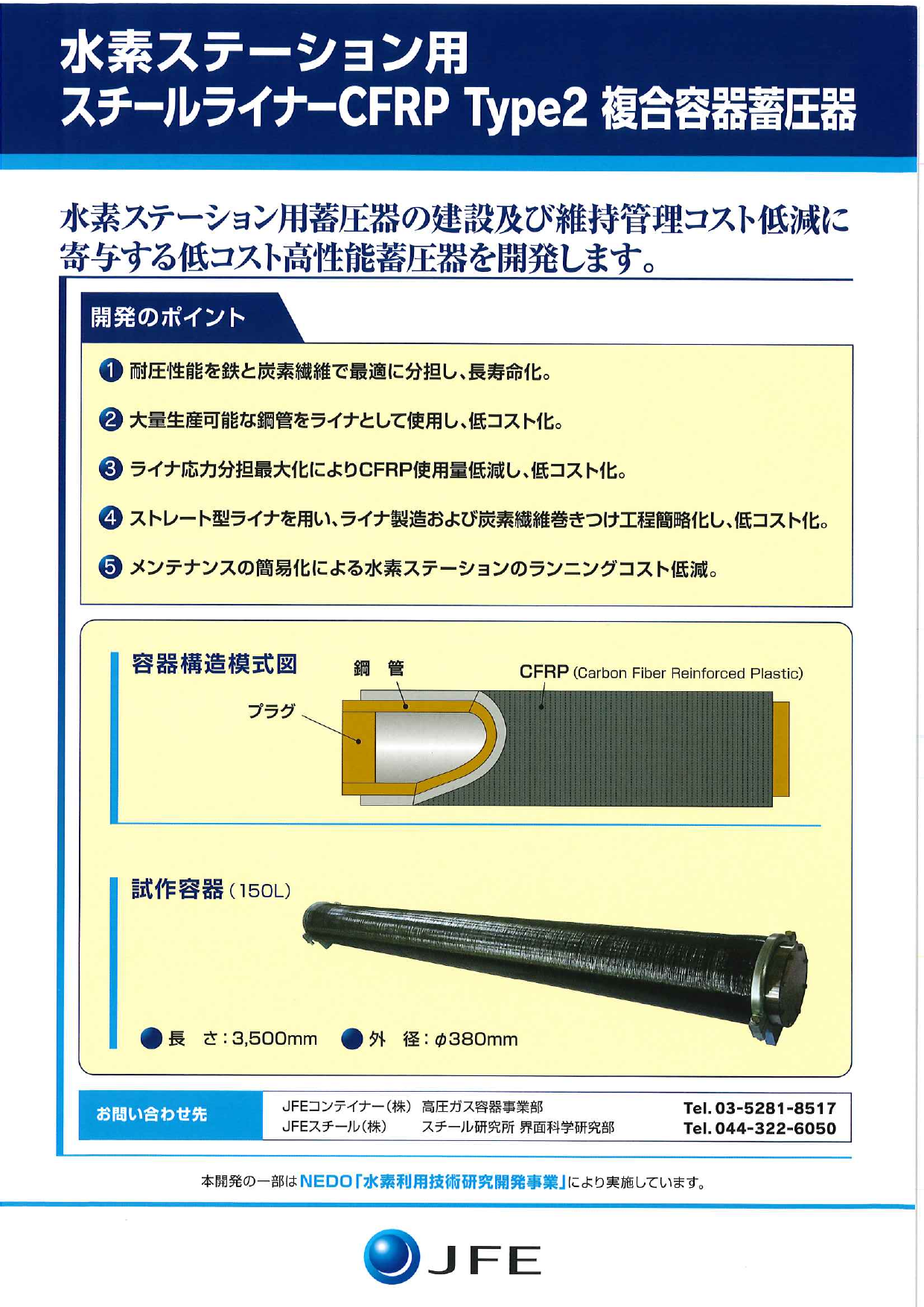 【掲載内容】 ・水素ステーション用スチールライナーCFRP Type2 複合容器蓄圧器 ・70MPa 燃料電池自動車搭載用 Type4 樹脂ライナー CFRP複合容器 ・水素供給システム用 45MPa Type1容器