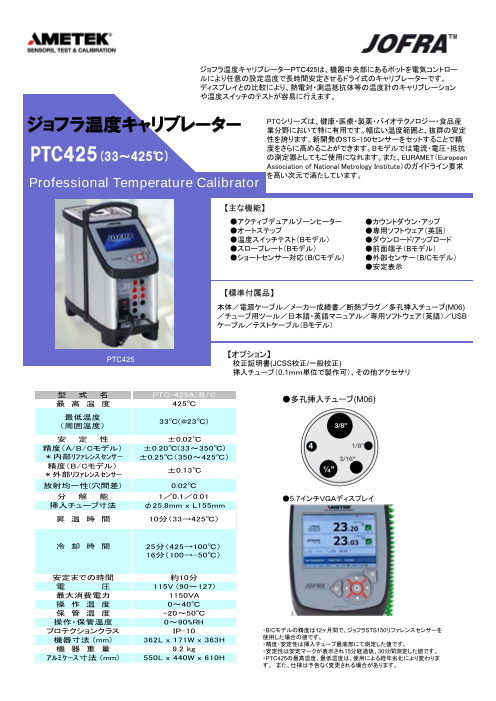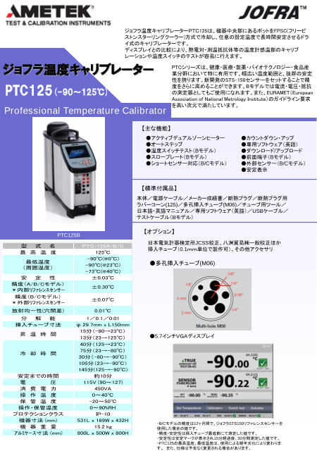 ジョフラ温度キャリブレーターPTC425は、機器中央部にあるポットを電気コントロールにより任意の設定温度で長時間安定させるドライ式のキャリブレーターです。 ディスプレイとの比較により、熱電対・測温抵抗体等の温度計のキャリブレーションや温度スイッチ...