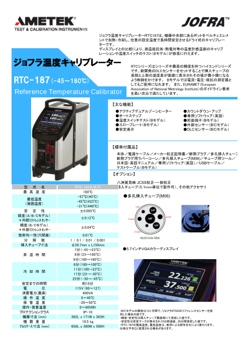 ジョフラ温度キャリブレーターRTC187は、機器中央部にあるポットをペルチェエレメントで加熱・冷却し、任意の設定温度で長時間安定させるドライ式のキャリブレーターです。 ディスプレイとの比較により、測温抵抗体・熱電対等の温度計感温部のキャリブレーショ...