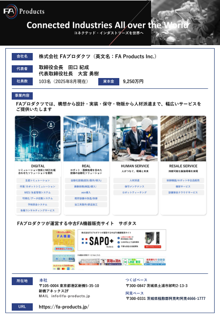 ■企業概要:製造業の変革をプロデュース 株式会社FAプロダクツは、「Connected Industries All over the World(コネクテッド・インダストリーズを世界へ)」を掲げ 、構想から設計・実装・保守・物販・人材派遣まで、幅広い...