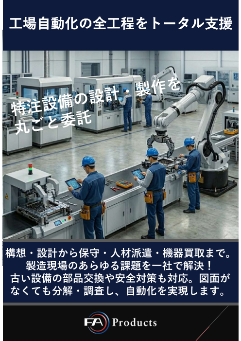 FAプロダクツでは、構想から設計・実装・保守・物販から人材派遣まで、 幅広いサービスをご提供いたします。 省人化/デジタル技術活用(DX)など 気になる項目御座いましたらお気軽にお問合せ頂けますと幸いです。 会社HP:https://fa...