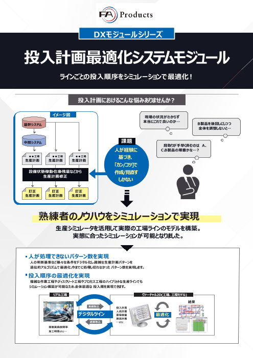 投入計画におけるこんな悩みありませんか? ・現場の状況がわからず本当にこれで良いのか… ・B製品を後回しにしつつ全体を調整しないと… ・段取りが手早く済むのはA、C、B製品の順番かな…? 【課題】 人が経験に基づき、「カン/コツ]で作成/見...