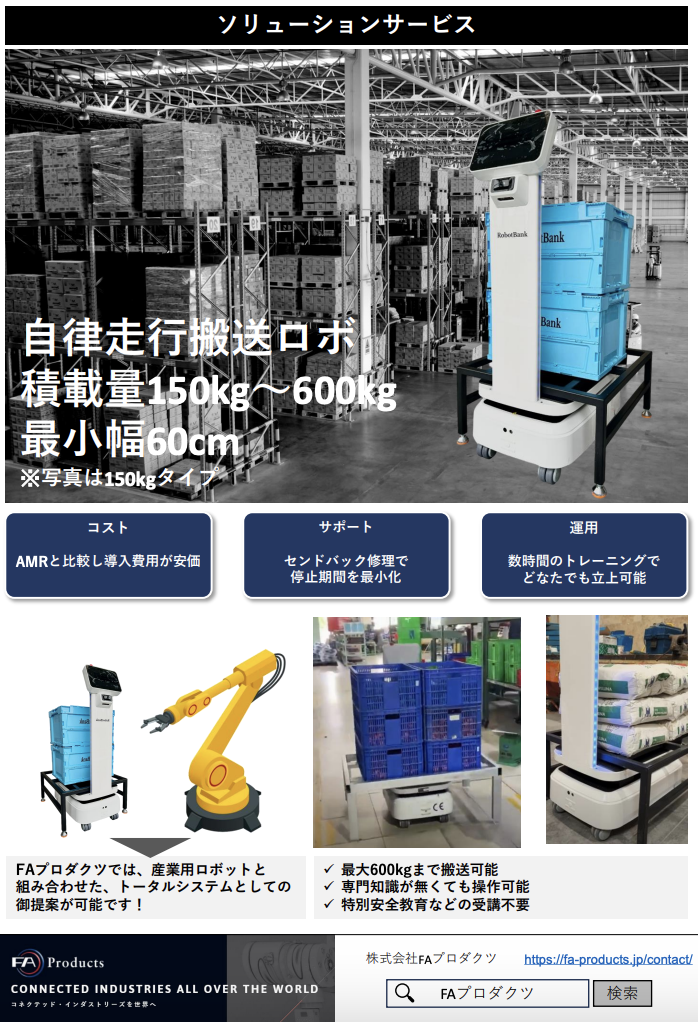 ◆積載量150kg~600kg / 最小幅60cm ◆AMRと比較し導入費用が安価 ◆センドバック修理で停止期間を最小化 ◆数時間のトレーニングでどなたでも立上可能 ◆詳細はカタログをダウンロードしご覧いただくか、お気軽にお問い合わせ下さい。