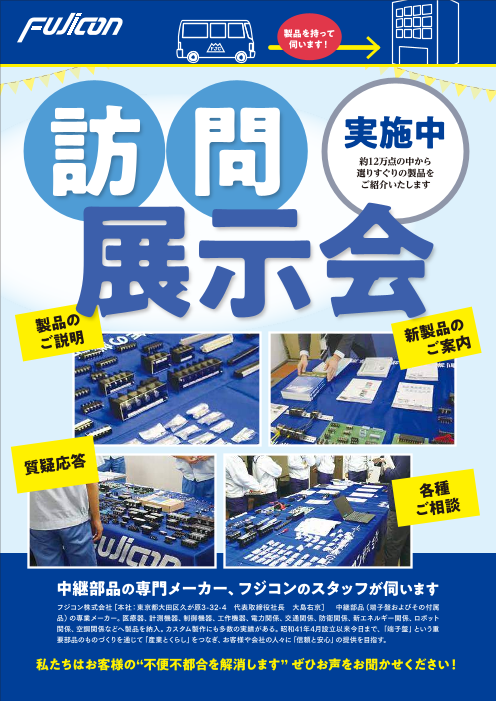 中継部品の専門メーカー、フジコンのスタッフが伺います 約12万点の製品からえ選りすぐりの製品を持ってお伺いします。 豊富なラインナップや製品の扱いやすさをぜひご確認ください フジコン株式会社 [本社:東京都大田区久が原3-32-4 代表取締役...