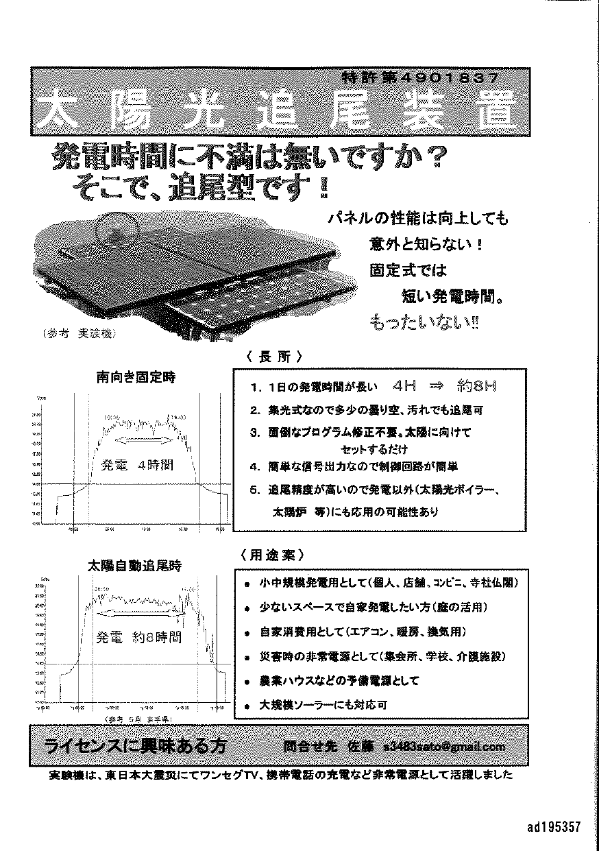パネルの性能は向上しても意外と知らない! 固定式では短い発電事案。もったいない!! <長所> 1.1日の発電時間が長い 4H→約8H 2.集光式なので多少の曇り空、汚れでも追尾可 3.面倒なプログラム修正不要。太陽に向けてセットするだけ ...