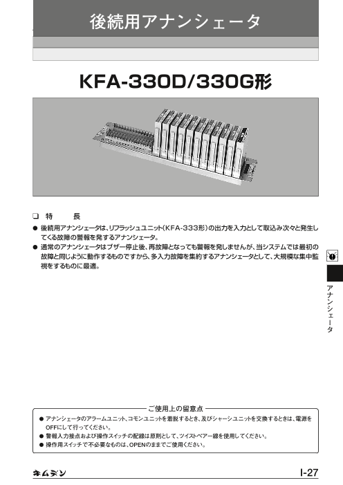 通常のアナンシェータはブザー停止後、再故障となっても警報を発しませんが、当システムでは最初の故障と同じように動作するものですから、多入力故障を集約するアナンシェータとして、大規模な集中監視をするものに最適。 ◆詳細はカタログをダウンロードしご覧いた...