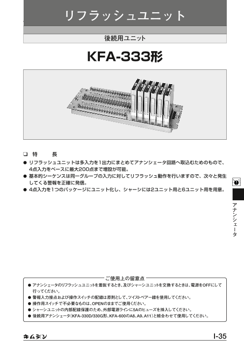◆リフラッシュユニットは多入力を1出力にまとめてアナンシェータ回路へ取込むためのもので、4点入力をベースに最大200点まで増設が可能。 ◆基本的シーケンスは同一グループの入力に対してリフラッシュ動作を行いますので、次々と発生してくる警報を正確に発信。 ...