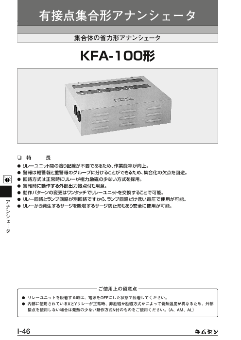 ◆リレーユニット間の渡り配線が不要であるため、作業能率が向上。 ◆警報は軽警報と重警報のグループに分けることができるため、集合化の欠点を回避。 ◆回路方式は正常時にリレーが極力励磁の少ない方式を採用。 ◆警報時に動作する外部出力接点付も用意。 ◆...