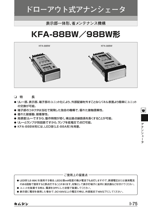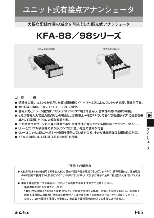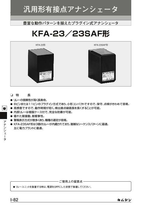 ◆リレー部、表示部、端子部のユニット化により、外部配線を外すことなくパネル表面より簡単にユニットの交換が可能。 ◆端子部のコネクタは当社で開発した独自の機構で、優れた接触信頼性。 ◆優れた耐振動、耐衝撃性。 ◆高感度リレーですから、動作時間が短く、...